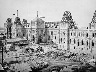 The British colonies which would eventually become Ontario and Quebec were from 1841 to 1867 known as Province of Canada. Ottawa, an industrial city of 10,000 people, became the capital of this united province in 1858, after the previous capital building in Montreal, Quebec was burned by an angry mob.[2] In 1859 construction began on the government buildings on Barracks Hill. Fuller and Jones won the contract for a new parliament building with a bid of ₤75,000.In 1867, with the passing of the British North America Act, Ottawa became the capital of the federated provinces of Canada, and Barracks Hill became Parliament Hill.[3]