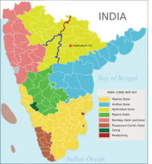 In 1956 during the reorganisation of the Indian States based along linguistic lines, the state of Hyderabad was split up among Andhra Pradesh and Bombay state (later Maharashtra) and Karnataka.[53]