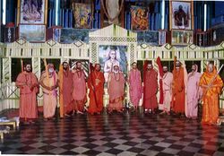 In their quest to attain the spiritual goal of life, some Hindus choose the path of monasticism (Sannyasa). Monastics commit themselves to a life of simplicity, celibacy, detachment from worldly pursuits, and the contemplation of God.[7] A Hindu monk is called a sanyāsī, sādhu, or swāmi.[8] A nun is called a sanyāsini, sādhvi, or swāmini. Such renunciates are accorded high respect in Hindu society, because their outward renunciation of selfishness and worldliness serves as an inspiration to householders who strive for mental renunciation. Some monastics live in monasteries, while others wander from place to place, trusting in God alone to provide for their physical needs.[9] It is considered a highly meritorious act for a lay devotee to provide sadhus with food or other necessaries. Sādhus are expected to treat all with respect and compassion, whether a person may be poor or rich, good or wicked. They are also expected to be indifferent to praise, blame, pleasure, and pain.[10] A sādhu can typically be recognized by his ochre-colored clothing. Generally, Vaisnava monks shave their heads except for a small patch of hair on the back of the head, while Saivite monks let their hair and beard grow uncut.