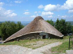 A palloza is a traditional thatched house as found in Leonese county of El Bierzo, Serra dos Ancares in Galicia, and south-west of Asturias; corresponding to Astur tribes area, one of pre Hispano-Celtic inhabitants of northwest Hispania. It is circular or oval, and about ten or twenty metres in diameter and is built to withstand severe winter weather at a typical altitude of 1,200 metres.