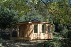 That Roundhouse is an early example of a modern roundhouse dwelling which was built in Pembrokeshire Coast National Park, Wales without planning permission as part of the Brithdir Mawr village which was discovered by the authorities in 1998.[2] It is constructed from a wooden frame of hand-cut Douglas Fir forest thinnings with cordwood infill, and reciprocal frame turf roof based on permaculture principles mainly from local natural resources. It was subject to a lengthy planning battle including a court injunction to force its demolition before finally receiving planning approval for 3 years in September 2008.[3]