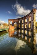 From the first century AD to the fifth century,[9] there was the Gallo-Roman settlement called vicus Saravus west of Saarbrücken's Halberg hill,[10] on the roads from Metz to Worms and from Trier to Strasbourg.[7] Since the first or second century AD,[7] a wooden bridge, later upgraded to stone,[6] connected vicus Saravus with the south-western bank of the Saar, today's St Arnual, where at least one Roman villa was located.[11] In the third century AD, a Mithras shrine was built in a cave in Halberg hill, on the eastern bank of the Saar river, next to today's old "Osthafen" harbor,[12] and a small Roman camp was constructed at the foot of Halberg hill[10] next to the river.[9]
