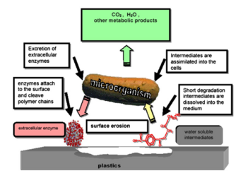 Microbes involved in the breakdown of fossil-based plastics typically use an indirect mechanism in which microbial enzymes break down the plastic. Through indirect action, the metabolic products of the microorganism affect the properties of the plastic, resulting in degradation.[3]
