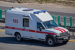 A two-wheel drive variant of the UAZ-450 was announced on 12 December 1961, with the UAZ-450's 2,300 mm (91 in) wheelbase and engine, as the UAZ-451 (van), UAZ-451D (drop-side pickup), UAZ-451A (ambulance), and UAZ-451B (minibus).[6] The ambulance spawned a prototype UAZ-452GP with hydropneumatic suspension, to enable it to cross rough ground at high speed, following on the work done by Citroën on the DS19.[6] The system proved very successful on trials, but it was rejected by the Soviet Army as too complicated, and so never entered production.[7]