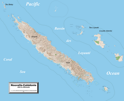listen))[nb 1] is a sui generis collectivity of overseas France in the southwest Pacific Ocean, south of Vanuatu, about 1,210 km (750 mi) east of Australia ,[2] and 17,000 km (11,000 mi) from Metropolitan France. The archipelago, part of the Melanesia subregion, includes the main island of Grande Terre, the Loyalty Islands, the Chesterfield Islands, the Belep archipelago, the Isle of Pines, and a few remote islets.[3] The Chesterfield Islands are in the Coral Sea. French people, especially locals, call Grande Terre "Le Caillou" ("the pebble").[4] It is one of the European Union’s Overseas Countries and Territories (OCTs),[5] but is not part of the European Union.[6]