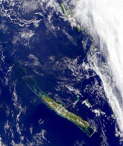 The rainfall records show that precipitation differs greatly within the island. The 3,000 millimetres (120 in) of rainfall recorded in Galarino are three times the average of the west coast. There are also dry periods, because of the effects of El Niño.[11] Between December and April, tropical depressions and cyclones can cause winds to exceed a speed of 100 kilometres per hour (62 mph), with gusts of 250 kilometres per hour (160 mph) and very abundant rainfall.[11] The last cyclone affecting New Caledonia was Cyclone Niran, in March 2021.