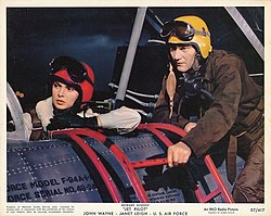 That same year, 1948, he was able to arrange for his previous films with United Artists (UA), The Outlaw, Mad Wednesday, and Vendetta to be transferred to RKO. In exchange for the three completed being removed from UA distribution, Hughes and James and Theodore Nasser of General Service Studios would provide the financing of three independent films for distribution by UA. In terms of negotiations directly with RKO, the company agree to remove the production of the film Jet Pilot from David O. Selznick to Hughes.[22] Hughes produced the film during the years 1949-1950 and owned RKO and in turn the distribution for the film. However, the film was not released until 1957 by Universal Pictures due in part to the subsequent events that would take place at RKO Distribution, and largely due the extra aerial film footage that had been filmed over the years after the film's 1950 completion. Hughes was undertaking a final edit before the 1957 release.[23]