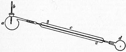 3. Fractional Distillation.—By fractional distillation is meant the separation of a mixture having components which boil at neighbouring temperatures. The distilling flask has an elongated neck so that the less volatile vapours are condensed and return to the flask, while the more volatile component passes over. The success of the operation depends upon two factors: (1) that the heating be careful, slow and steady, and (2) that the column attached to the flask be efficient to sort out, as it were, the most volatile vapour. Three types of columns are employed: (1) the elongation is simply a straight or bulb tube; (2) the column, properly termed a “dephlegmator,” is so constructed that the vapours have to traverse a column of previously condensed vapour; (3) the column is encircled by a jacket through which a liquid circulates at the same temperature as the boiling-point of the most volatile component. To the first type belongs the simple straight tube, and the Wurtz tube (see fig. 3), which is simply a series of bulbs blown on a tube. These forms are not of much value. Several forms of the second type are in use. In the Linnemann column the condensed vapours temporarily collect on platinum gauzes (a) placed at the constrictions of a bulbed tube. In the Le Bel-Henninger form a series of bulbs are connected consecutively by means of syphon tubes (b) and having platinum gauzes (a) at the constrictions, so that when a certain amount of liquid collects in any one bulb it syphons over into the next lower bulb. The Glynsky form is simpler, having only one syphon tube; at the constrictions it is usual to have a glass bead. The “rod-and-disk” form of Sidney Young is a series of disks mounted on a central spindle and surrounded by a slightly wider tube. The “pear-shaped” form of the same author consists of a series of pear-shaped bulbs, the narrow end of one adjoining the wider end of the next lower one. In this class may also be placed the Hempel tube, which is simply a straight tube filled with glass beads. Of the third type is the Warren column consisting of a spiral kept at a constant temperature by a liquid bath. Improved forms were devised by F. D. Brown. Kreusler’s form is easily made and manipulated. A tube closed at the bottom is traversed by an open narrower tube, and the arrangement is fitted in the neck of the distilling flask. Water is led in by the inner tube, and leaves by a side tube fused on the wider tube. Many comparisons of the effectiveness of dephlegmating columns have been made (see Sidney Young, Fractional Distillation, 1903). The pear-shaped form is the most effective, second in order is the Le Bel-Henninger, which, in turn, is better than the Glynsky. The main objection to the Hempel is the retention of liquid in the beads, and the consequent inapplicability to the distillation of small quantities.