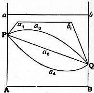 Van’t Hoff (Theoretical and Physical Chemistry, vol. i. p. 51) illustrates the five cases on one diagram. In fig. 4 let AB be the axis of composition, AP be the vapour pressure of pure A, BQ the vapour pressure of pure B. For immiscible liquids the vapour pressure curve is the horizontal line ab, described so that aP = QB and bQ = AP. For partially miscible liquids the curve is Pa1b1Q. The horizontal line a1b1 corresponds to the two layers of liquid, and the inclined lines Pa1Qb1 to solutions of B in A and of A in B. The curves Pa4Q, having a minimum at a4, Pa3Q, having a maximum at a3, and Pa5Q, with neither a maximum nor minimum, correspond to the types i., ii., iii. of completely miscible mixtures.