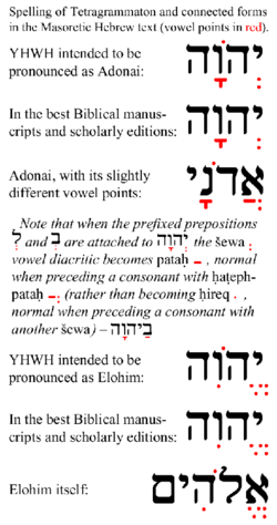 The most widespread theory is that the Hebrew term יְהֹוָה has the vowel points of אֲדֹנָי (adonai).[33] Using the vowels of adonai, the composite hataf patah (ֲ) under the guttural alef (א) becomes a sheva (ְ) under the yod (י), the holam (ֹ) is placed over the first he (ה), and the qamats (ָ) is placed under the vav (ו), giving יְהֹוָה (Jehovah). When the two names, יהוה and אדני, occur together, the former is pointed with a hataf segol (ֱ) under the yod (י) and a hiriq (ִ) under the second he (ה), giving יֱהֹוִה, to indicate that it is to be read as elohim in order to avoid adonai being repeated.[33][34]