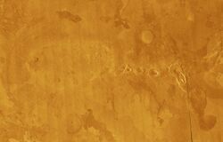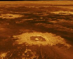 From Handwiki The surface of Venus is dominated by geologic features that include volcanoes, large impact craters, and aeolian erosion and sedimentation landforms. Venus has a topography reflecting its single, strong crustal plate, with a unimodal elevation distribution (over 90% of the surface lies within an elevation of -1.0 and 2.5 km)[1] that preserves geologic structures for long periods of time. Studies of the Venusian surface are based on imaging, radar, and altimetry data collected from several exploratory space probes, particularly Magellan, since 1961 (see Venus Exploration). Despite its similarities to Earth in size, mass, density, and possibly composition, Venus has a unique geology that is unlike Earth's. Although much older than Earth's, the surface of Venus is relatively young compared to other terrestrial planets (<500 million years old), possibly due to a global-scale resurfacing event that buried much of the previous rock record.[2] Venus is believed to have approximately the same bulk elemental composition as Earth, due to the physical similarities, but the exact composition is unknown. The surface conditions on Venus are more extreme than on Earth, with temperatures ranging from 453 to 473 °C and pressures of 95 bar.[3] Venus lacks water, which makes crustal rock stronger and helps preserve surface features. The features observed provide evidence for the geological processes at work. Twenty feature types have been categorized thus far. These classes include local features, such as craters, coronae, and undae, as well as regional-scale features, such as planitiae, plana, and tesserae.[4]