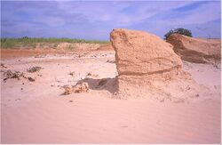 Recent Magellan images show over 6,000 aeolian landforms, including dunes (or undae), windstreaks, and yardangs. Undae and yardangs have direct analogues on Earth and the process that creates them here can be applied to those seen on Venus. Large dune fields have been identified on the surface and the dunes range in size from meters to hundreds of meters. Similarly, yardang fields may exist in locations such as Mead crater.[4] Windstreaks are parallel linear streaks that form as prevailing winds erode the surface geology. These features illustrate the erosive effect the atmosphere has on the surface of Venus.[15]