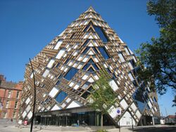 To the east of the main campus lies St George's campus, named after St George's Church (now a lecture theatre and postgraduate residence). The campus is the historical location of the Sheffield Technical School. It is bounded by Upper Hanover Street to the west, Broad Lane to the north, Rockingham Street to the east, and West Street to the south,[52] and is part of St George's Quarter, one of the seven official Sheffield city centre quarters.[65] Also known as the Engineering campus,[66] St George's campus is centred on Mappin Street, the location of the Faculty of Engineering (partly housed in the Grade II-listed Mappin Building) and the Department of Journalism Studies, Department of Economics and Department of Computer Science. The university also maintains the Turner Museum of Glass in this area. As part of the 2000s development plan, the university has converted the listed Victorian Jessop Hospital for Women into the new home of the Department of Music in 2009. The formerly Grade II-listed Edwardian wing of the Jessop Hospital was demolished after Sheffield City Council's planning committee voted for approval.[67] The building was replaced by a new £81 million building for the Faculty of Engineering which opened in September 2015, named the Diamond. It is a purpose-built multi-disciplinary building that houses lecture theatres, laboratories, workrooms and other facilities for the teaching of engineering.[68][69] Amongst the more recent additions to the university's estate located on this campus are the Soundhouse (2008; a music practice and studio facility) and the Jessop West building (2009; the first UK project by Berlin architects Sauerbruch Hutton).[70]