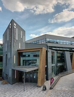 Further west lies Weston Park, the Weston Park Museum, the Harold Cantor Gallery, university's sports facilities Goodwin Sports Centre in the Crookesmoor area, and the Faculty of Medicine, Dentistry and Health around the Royal Hallamshire Hospital (although these subjects are taught in the city's extensive teaching hospitals under the Sheffield Teaching Hospitals NHS Foundation Trust, and throughout South Yorkshire and North East Lincolnshire). It is in this area that the new £12 million Sheffield Institute for Translational Neuroscience (SITraN), opened by Her Majesty Queen Elizabeth II in November 2010, is located.[74] There is a cluster of buildings located to the north of Broad Lane, opposite St George's campus, collectively called the north campus. Kroto Research Institute, Kroto Innovation Centre, Nanoscience and Technology Building, Graduate Research Centre, George Porter Building and the International College are based on this campus area.[75] To the south of the city on Warminster Road are where the sports pitches at Norton Sports Park located.[76] The university also operates Advanced Manufacturing Research Centres (AMRCs) on the border of Sheffield, in Rotherham and Lancashire.[77] The Conference Centre and Teaching Hall at Philadelphia Campus of St. Thomas' Church are used as exam venues by the university.[78]