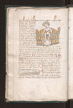 Medieval readers of the Trotula texts would have had no reason to doubt the attribution they found in the manuscripts, and so "Trotula" (assuming they understood the word as a personal name instead of a title) was accepted as an authority on women's medicine. The physician Petrus Hispanus (mid-13th century), for example, cited "domina Trotula" (Lady Trotula) multiple times in his section on women's gynecological and obstetrical conditions. The Amiens chancellor, poet, and physician, Richard de Fournival (d. 1260), commissioned a copy headed "Incipit liber Trotule sanatricis Salernitane de curis mulierum" ("Here begins the book of Trotula, the Salernitan female healer, on treatments for women").[28] Two copies of the Latin Trotula ensemble include imaginative portrayals of the author; the pen-and-ink wash image found in an early 14th-century manuscript now held by the Wellcome Library is the most well-known image of "Trotula" (see image above).[29] A few 13th-century references to "Trotula," however, cite her only as an authority on cosmetics.[30] The belief that "Trotula" was the ultimate authority on the topic of women's medicine even caused works authored by others to be attributed to her, such as a 15th-century Middle English compendium on gynecology and obstetrics based on the works of the male authors Gilbertus Anglicus and Muscio, which in one of its four extant copies was called the Liber Trotularis.[31] Similarly, a 14th-century Catalan author entitled his work primarily focused on women's cosmetics Lo libre . . . al qual a mes nom Trotula ("The Book ... which is called 'Trotula'").[32]