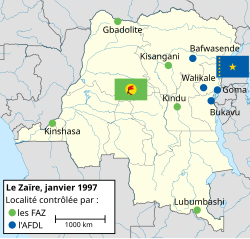 In view of the advance of Kabila's troops in eastern Zaire, in early 1997 the FAZ launched two counter-attacks from Kisangani towards Bafwasende and Walikale, with the battalion's forces of order (500 to 700 men).[23] They were defeated between January 20 and 25, 1997.[1]