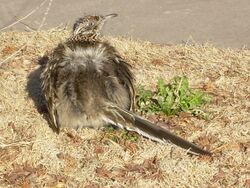 The roadrunner frequently sunbathes for warmth. It turns perpendicular to the ground with its back turned towards the sun. Wings apart, the roadrunner ruffles the black feathers on its back and head, exposing its black skin, allowing both skin and feathers to absorb the heat of the sun's rays.[36] Early in the morning, it can stay in this posture for two or three hours.[37] In winter, when the temperatures are around 68 °F (20 °C), roadrunners may warm themselves in the sun several times during the day for more than half an hour at a time.[4]