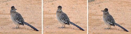 The roadrunner is about 52–62 cm (20–24 in) long, has a 43–61 cm (17–24 in) wingspan and weighs 221–538 g (7.8–19.0 oz). It stands around 25–30 cm (9 3⁄4–11 3⁄4 in) tall and is the largest cuckoo of the Americas.[12][13][14] The upper body is mostly brown with black streaks and sometimes pink spots. The neck and upper breast are white or pale brown with dark brown streaks, and the belly is white. A crest of brown feathers sticks up on the head, and a bare patch of orange and blue skin lies behind each eye;[15] the blue is replaced by white in adult males (except the blue adjacent to the eye), and the orange (to the rear) is often hidden by feathers.[4] Males and females have identical plumage. Females are slightly smaller, on average 2 cm (3⁄4 in) shorter and 30 g (1.1 oz) lighter than males. The long stout beak is grayish brown to gray and has a hooked tip. Roadrunners have four toes on each zygodactyl foot; two face forward, and two face backward.[16] The toes are brown in color and have pale gold spots.[4]