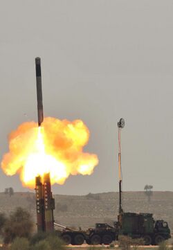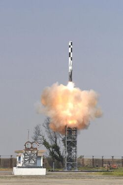 BrahMos was first test-fired on 12 June 2001 from the Integrated Test Range (ITR), Chandipur in a vertical launch configuration. On 14 June 2004, another test was conducted at ITR and BrahMos was fired from a mobile launcher.[44] On 5 March 2008, the land attack version of the missile was fired from the destroyer INS Rajput and the missile hit and destroyed the right target among a group of targets.[45][46] The vertical launch of BrahMos was conducted on 18 December 2008 from INS Ranvir.[47] The BrahMos I Block-I for the army was successfully tested with new capabilities in the deserts of Rajasthan, at a test range near Pokharan in December 2004 and March 2007.[48]