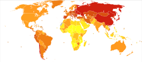 Globally, stomach cancer is the fifth leading type of cancer and the third leading cause of death from cancer, making up 7% of cases and 9% of deaths.[16] In 2018, it newly occurred in 1.03 million people and caused 783,000 deaths.[10] Before the 1930s, in much of the world, including most Western developed countries, it was the most common cause of death from cancer.[17][18] Rates of death have been decreasing in many areas of the world since then.[2] This is believed to be due to the eating of less salted and pickled foods as a result of the development of refrigeration as a method of keeping food fresh.[19] Stomach cancer occurs most commonly in East Asia and Eastern Europe.[2] It occurs twice as often in males as in females.[2]