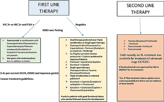 Recently, treatment with human epidermal growth factor receptor 2 (HER2) inhibitor, trastuzumab, has been demonstrated to increase overall survival in inoperable locally advanced or metastatic gastric carcinoma over-expressing the HER2/neu gene.[6] In particular, HER2 is overexpressed in 13–22% of patients with gastric cancer.[75][80] Of note, HER2 overexpression in gastric neoplasia is heterogeneous and comprises a minority of tumor cells (less than 10% of gastric cancers overexpress HER2 in more than 5% of tumor cells). Hence, this heterogeneous expression should be taken into account for HER2 testing, particularly in small samples such as biopsies, requiring the evaluation of more than one bioptic sample.[80]