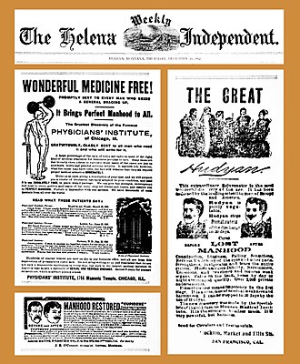 One ad from 1897 claims to restore "perfect manhood. Failure is impossible with our method".[42] Another "will quickly cure you of all nervous or diseases of the generative organs, such as Lost Manhood, Insomnia, Pains in the Back, Seminal Emissions, Nervous Debility, Pimples, Unfitness to Marry, Exhausting Drains, Varicocele and Constipation".[42] The U.S. Federal Trade Commission warns that "phony cures" exist even today.[43]