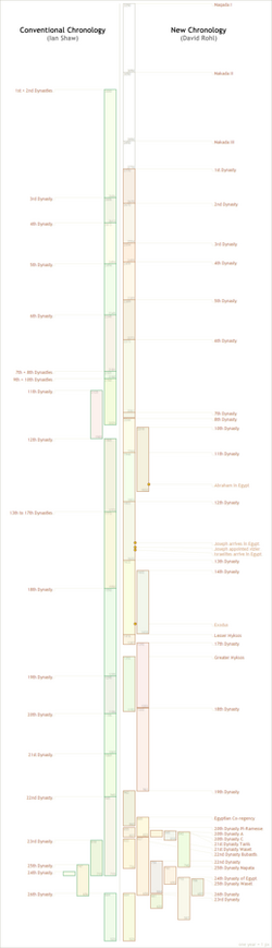 From Handwiki New Chronology is an alternative chronology of the ancient Near East developed by English Egyptologist David Rohl and other researchers[1][2] beginning with A Test of Time: The Bible - from Myth to History in 1995. It contradicts mainstream Egyptology by proposing a major revision of the established Egyptian chronology, in particular by re-dating Egyptian kings of the Nineteenth through Twenty-fifth Dynasties, bringing forward conventional dating by up to 350 years. Rohl asserts that the New Chronology allows him to identify some of the characters in the Hebrew Bible with people whose names appear in archaeological finds.