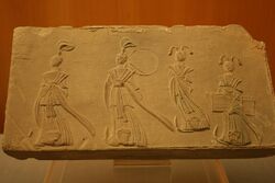 Secondly, wu could be cognate with wǔ 舞 "to dance". Based on analysis of ancient characters, Hopkins({{{1}}}, {{{2}}}) proposed that wū 巫 "shaman", wú 無 "not have; without", and wǔ 舞 "dance", "can all be traced back to one primitive figure of a man displaying by the gestures of his arms and legs the thaumaturgic powers of his inspired personality".[20] Many Western Han dynasty tombs contained jade plaques or pottery images showing "long-sleeved dancers" performing at funerals, whom Erickson identifies as shamans, citing the Shuowen jiezi that early wǔ characters depicted a dancer's sleeves.[21]