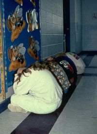 During school tornado drills students are required to huddle up against the walls (picture above) of the building usually the hallway to prevent harm to the students and sometimes staff (teachers, janitors, etc) will also huddle against the wall to prevent harm.
