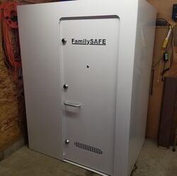 In private homes, some similar stairway rooms have been used, or an interior room/closet kept clear to quickly allow entry when a storm is seen or heard approaching (the wind roar intensifies, sounding like a swift "freight train" coming nearer, louder).[2] With weeks or months to prepare, an interior safe room can be constructed, with space for emergency water, food and flashlights, and a telephone to call for rescue if the exit becomes blocked by falling debris. Some above-ground safe rooms have been built with steel-rebar rods in cement-filled cinder blocks, to withstand winds of 250 miles per hour (400 km/h). Rural homes might have an outside storm cellar, or other external bunker, to avoid being trapped within a collapsing house. In rural homes, generators are also helpful to maintain power with enough fuel for a few days.