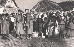 ![]() Expulsion of Poles from Reichsgau Wartheland following the Invasion of Poland (1939). Families led to the trains under German escort, as part of Nazi German ethnic cleansing of annexed Poland. | |