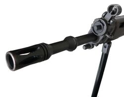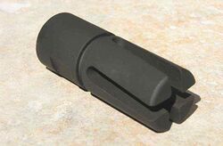 A flash suppressor, also known as a flash guard, flash eliminator, flash hider, or flash cone, is a muzzle device attached to the muzzle of a rifle that reduces its visible signature while firing by cooling or dispersing the burning gases that exit the muzzle, a phenomenon typical of carbine-length weapons. Its primary intent is to reduce the chances that the shooter will be blinded in low-light shooting conditions. Contrary to popular belief, it is only a minor secondary benefit if a flash suppressor reduces the intensity of the flash visible to the enemy.[citation needed]