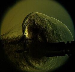 The Vortex Flash Hider is a design developed in 1984, with a patent secured in 1995. The Vortex is somewhat reminiscent of the original "three-prong flash hider" found on the original Vietnam-era M16. However, the Vortex is more robust and makes use of four solid tines, which are equally spaced and angled 6° from a centerline, while the slots of the body incorporate a 5-, 10-, and 15-degree twisted helix design, which eliminates up to 99% of visible muzzle flash by having the flash break up at multiple locations and angles.