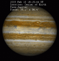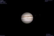 A simulated view of an Io transit of Jupiter as viewed from the Earth, showing the shadow apparently leading Io.