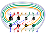 Another early version of the problem involves connecting three houses to three wells.[6] It is stated similarly to a different (and solvable) puzzle that also involves three houses and three fountains, with all three fountains and one house touching a rectangular wall; the puzzle again involves making non-crossing connections, but only between three designated pairs of houses and wells or fountains, as in modern numberlink puzzles.[7] Loyd's puzzle "The Quarrelsome Neighbors" similarly involves connecting three houses to three gates by three non-crossing paths (rather than nine as in the utilities problem); one house and the three gates are on the wall of a rectangular yard, which contains the other two houses within it.[8]
