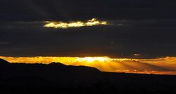 Striking cloud colorations can be seen at any altitude, with the color of a cloud usually being the same as the incident light.[116] During daytime when the sun is relatively high in the sky, tropospheric clouds generally appear bright white on top with varying shades of gray underneath. Thin clouds may look white or appear to have acquired the color of their environment or background. Red, orange, and pink clouds occur almost entirely at sunrise/sunset and are the result of the scattering of sunlight by the atmosphere. When the Sun is just below the horizon, low-level clouds are gray, middle clouds appear rose-colored, and high clouds are white or off-white. Clouds at night are black or dark gray in a moonless sky, or whitish when illuminated by the Moon. They may also reflect the colors of large fires, city lights, or auroras that might be present.[116]