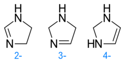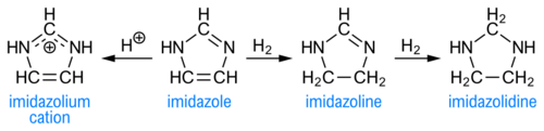 Imidazoline is a class of heterocycles formally derived from imidazoles by the reduction of one of the two double bonds. Three isomers are known, 2-imidazolines, 3-imidazolines, and 4-imidazolines. The 2- and 3-imidazolines contain an imine center, whereas the 4-imidazolines contain an alkene group. The 2-Imidazoline group occurs in several drugs.[1]