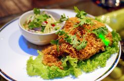 Yam pladuk fu (Thai: ยำปลาดุกฟู): shredded and deep fried Clarias (pla duk) catfish with saladPecel lele, an Indonesian-style deep fried Clarias (lele); usually sold as street food