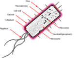 A bacterium (pl. bacteria) is a single-celled organism lacking the more complex organelles such as mitochondria and chloroplasts, which are themselves thought to be symbiotic bacteria (see endosymbiosis). They reproduce by binary fission[note 1] and share genes through transfer of plasmids, small ring-shaped chains of DNA.