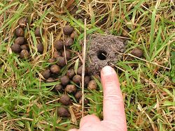 The minotaur beetle is found in certain regions of Europe and North Africa. It lives in sandy, sunny areas of pine forests or in sandy moorland. They are rare elsewhere. In Germany, the minotaur beetle is an "especially protected" species and is protected under the Bundesartenschutzverordnung (BArtSchV).[5] The adult beetles are rarely seen. More noticeable are the open, circular, about 1 cm long entrances to their living spaces, which can be found on ground with sparse vegetation.