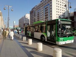 The bus transport system in Medina was established in 2012 by the MMDA and is operated by SAPTCO. The newly established bus system includes 10 lines connecting different regions of the city to Masjid an-Nabawi and the downtown area, and serves around 20,000 passengers on a daily basis.[72][73] In 2017, the MMDA launched the Madinah Sightseeing Bus service. Open top buses take passengers on sightseeing trips throughout the day with two lines and 11 destinations, including Masjid an-Nabawi, Quba'a Mosque and Masjid al-Qiblatayn and offers audio tour guidance with eight different languages.[74] By the end of 2019, the MMDA announced its plan to expand the bus network with 15 BRT lines. The project was set to be done in 2023.[75] In 2015, the MMDA announced a three-line metro project in extension to the public transportation master plan in Medina.[76]