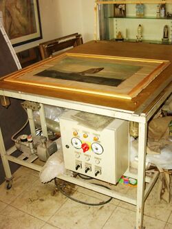 The Table works by manipulating atmospheric pressure to provide workpiece force against a surface. This increases static friction against forces of a cutter of various types used today. An atmospheric pressure, up to 29 inHg allows clamping force of approx 14 PSI at sea level.