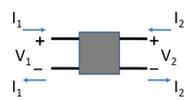 A two-port network (a kind of four-terminal network or quadripole) is an electrical network (circuit) or device with two pairs of terminals to connect to external circuits. Two terminals constitute a port if the currents applied to them satisfy the essential requirement known as the port condition: the electric current entering one terminal must equal the current emerging from the other terminal on the same port.[22][23] The ports constitute interfaces where the network connects to other networks, the points where signals are applied or outputs are taken. In a two-port network, often port 1 is considered the input port and port 2 is considered the output port.