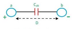 The capacitance of a single phase transmission line can be given mathematically by : [math]\displaystyle{ C_{ab} = \frac{\pi \epsilon_0}{ln\frac{D}{r}} F/m }[/math]