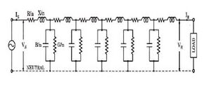 A transmission line having a length more than 250 km is considered as a long transmission line. Unlike short and medium lines the line parameters of long transmission line are assumed to be distributed at each point of line uniformly. Thus modelling of a long line is somewhat difficult. But few approaches can be made based on the length and values of line parameters. For a long transmission line, it is considered that the line may be divided into various sections, and each section consists of inductance, capacitance, resistance and conductance, as shown in the RLC (resistance and inductance in series, with shunt capacitance) cascade model.