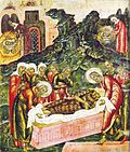 Russian Orthodox painting of John's burial by his students. The left head shows Herodias admiring it, and the left head shows Herodias' maid hiding it in a cave.