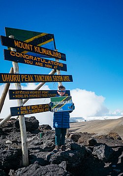 The oldest person to climb Mount Kilimanjaro is Anne Lorimor, aged 89 years and 37 days, who reached Uhuru Peak at 3:14 p.m. local time on 18 July 2019.[78][79] The oldest man to summit is American Fred Dishelhorst, who reached the top on 19 July 2017 at the age of 88 years old.[80] The second oldest man to summit the mountain is the American Robert Wheeler, who was 85 years and 201 days when he summited on 2 October 2014.[81] Maxwell J. Ojerholm of Massachusetts, USA, reached Uhuru Peak, the true summit, unassisted, at the age of ten years, on July 4, 2009, taking the difficult Machame Route. Colin M. Barker of Missouri, USA, later completed the same route at the age of ten years on December 22, 2020. Theodore Margaroli from London, age 10, reached the summit unassisted by the Western Breach, the hardest but most scenic route, in 2019.[81][82] Despite an age-limit of 10 years for a climbing permit, Keats Boyd from Los Angeles reached the summit on 21 January 2008 at the age of 7.[81] This record was equaled by Montannah Kenney from Texas in March 2018.[81][83] The fastest ascent and the fastest round trip have been recorded by the Swiss-Ecuadorian mountain guide Karl Egloff. On 13 August 2014, after guiding a party to the summit the previous days, he ran from Umbwe Gate to the top in 4 hours and 56 minutes and returned to the Mweka Gate at 1,630 m (5,350 ft) in a total time of 6 hours, 42 minutes and 24 seconds.[84][85] Previous records, using the same route, were held by Spanish mountain runner Kílian Jornet (ascent in 5:23:50, round trip 7:14 on 29 September 2010) and by Tanzanian guide Simon Mtuy (an unsupported round trip in 9:21 on 22 February 2006).[86][81][87]