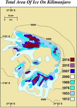 Almost 85 percent of the ice cover on Kilimanjaro disappeared between October 1912 and June 2011, with coverage decreasing from 11.40 km2 (4.40 sq mi) to 1.76 km2 (0.68 sq mi).[39]:423 Between 1912 and 1953, there was about a 1.1 percent average annual loss of ice coverage.[35] The average annual loss for 1953 to 1989 was 1.4 percent, while the loss rate for 1989 to 2007 was 2.5 percent.[35] Of the ice cover still present in 2000, almost 40 percent had disappeared by 2011.[39]:425 Ice climber Will Gadd noticed differences between his 2014 and 2020 climbs.[40] The glaciers are thinning in addition to losing areal coverage,[35] and do not have active accumulation zones; retreat occurs on all glacier surfaces. Loss of glacier mass is caused by both melting and sublimation.[31] While the current shrinking and thinning of Kilimanjaro's ice fields appear to be unique within its almost twelve-millennium history, it is contemporaneous with widespread glacier retreat in mid-to-low latitudes across the globe.[35] In 2013, it was estimated that, at the current rate of global warming, most of the ice on Kilimanjaro will disappear by 2040, and "it is highly unlikely that any ice body will remain after 2060".[39]:430