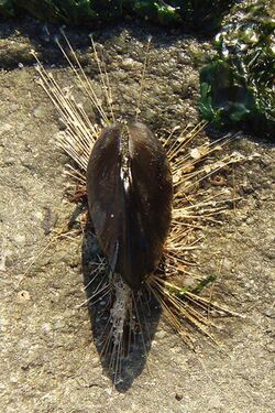 In marine mussels, the foot is smaller, tongue-like in shape, with a groove on the ventral surface which is continuous with the byssus pit. In this pit, a viscous secretion is exuded, entering the groove and hardening gradually upon contact with sea water. This forms extremely tough, strong, elastic, byssal threads that secure the mussel to its substrate allowing it to remain sessile in areas of high flow.[2] The byssal thread is also sometimes used by mussels as a defensive measure, to tether predatory molluscs, such as dog whelks, that invade mussel beds, immobilising them and thus starving them to death.