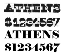 In the metal type era, type-founding companies often would offer pre-formed illustrations as fonts showing objects and designs likely to be useful for printing and advertisements, the equivalent of modern clip art and stock photographs.[65] As examples, the American Type Founders specimen of 1897 offered designs including baseball players, animals, Christmas wreaths, designs for cheques, and emblems such as state seals for government printing.[66] The practice has declined as printing custom illustrations and colour printing using processes such as lithography has become cheaper, although illustration typefaces are still sold by some companies. See above for the historical definition of display typeface.